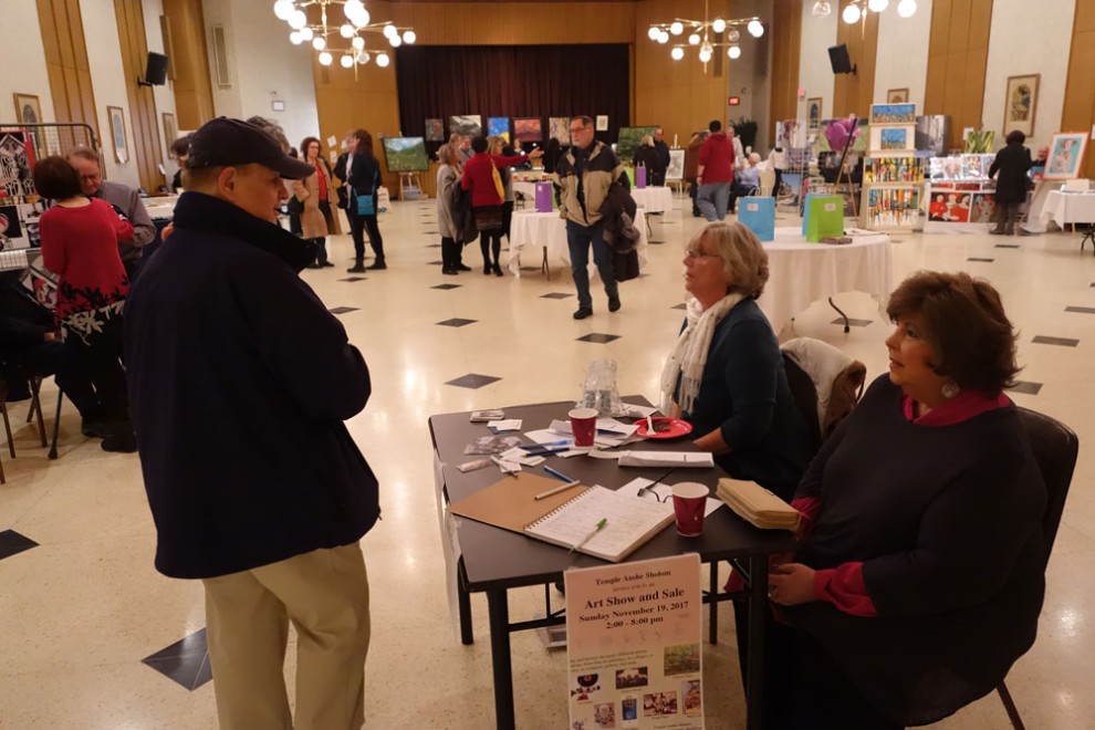 November 19, 2017 was the day that Temple Anshe Sholom hosted its first annual art show. This was a project of the synagogue's social action committee as an opportunity to help raise awareness about local Jewish artists and to help them engage with the community in a meaningful way. Fifteen artists displayed their fine art included paintings, jewelry, photography, collages, Chinese brush painting, Judaic textiles, etched glassware, and more. A “by invitation” only show, the committee made the decision to choose artists who produce fine art as opposed to crafts. One visitor said that the high level of the artwork inspired her to go back to making art herself. There was a constant flow of people who came to browse and shop. Each artist donated a piece from their collection to a raffle that allowed ticket purchasers to choose which work of art that they wanted to win. Live music was provided by Doug Collins on his harp throughout the event. Refreshments were donated by Cake and Loaf, the Dundurn Market, Fortino’s on Main Street and from the artists themselves.